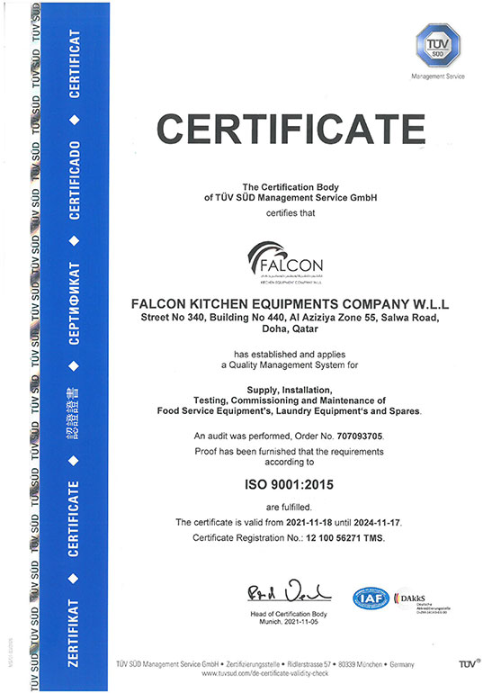 Falcon Kitchen Equipment Co.W.L.L. is an ISO 9001:2008 certified company. We aspire for excellence in all our ventures. The Company aims to provide impeccable service through stringent quality assurances and checks. Our policy of continuous improvement helps us revitalise our shared knowledge of the arena and grow as a company while our strong networks, built over the last two decades help us provide high quality products and services. Our vital partnerships with some of the world`s leading Original Equipment Manufacturers in the Food Service & Food Equipment Sector enable easy access to top global products. We bring the world`s best brands to Qatar with services to match.